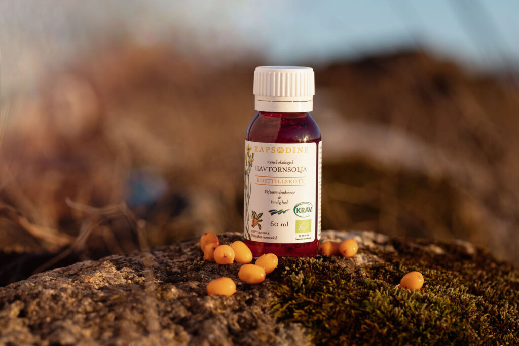 Vår havtornsolja kommer från svenska ekologiska havtornsbär och innehåller stora mängder av den sällsynta fettsyran omega 7, men även fettsyrorna omega 3, 6 och 9 samt vitamin E och betakaroten. Havtornsoljan används som ett kosttillskott för invärtes bruk men du kan också använda en liten droppe olja (ca 1-3 %) i din ansiktskräm för en extra gyllene boost! Den har nyligen fått en ny förpackning i form av glasflaska med pipett som förenklar doseringen. Havtorn finns även i vårt schampo, intimduscholja och bodyoil.